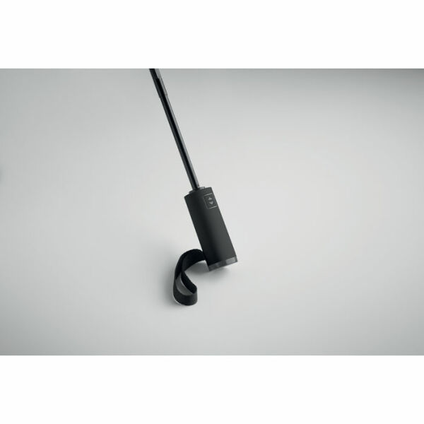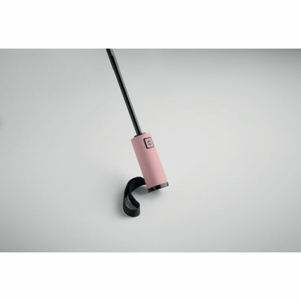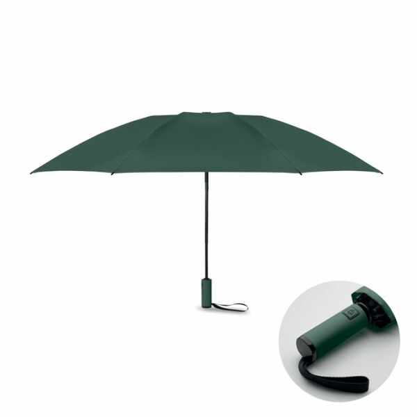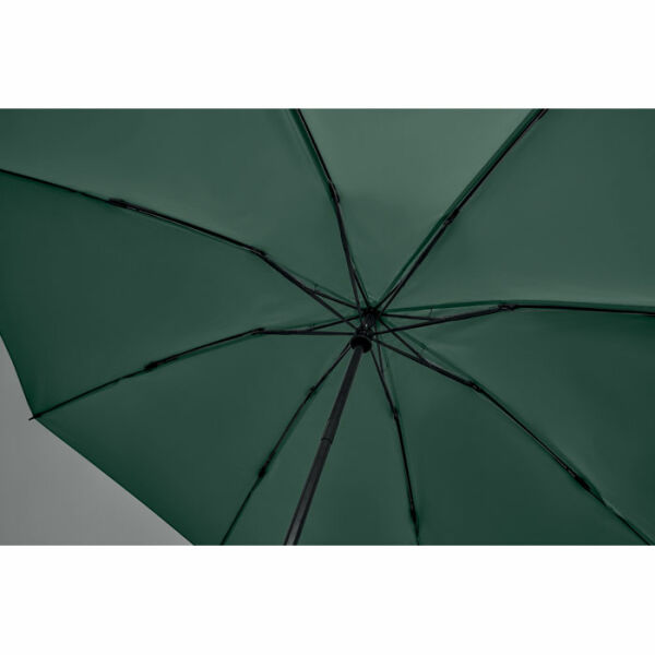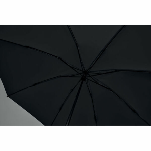 23 inch 3-voudige omgekeerde windbestendige paraplu van 190T RPET-pongee en bijpassende pouch. Auto open en dicht, volledig zwart frame, glasvezel baleinen en een ABS handvat met rubberen afwerking.