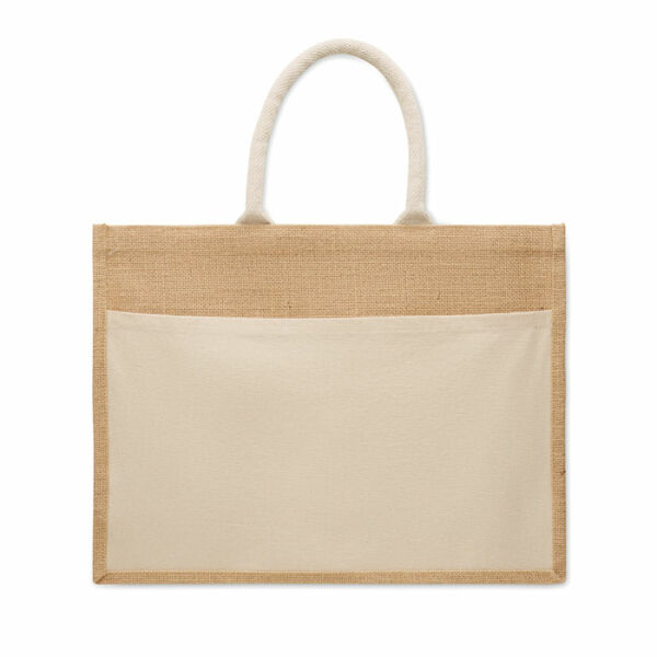 Boodschappentas van gelamineerde jute en 280g/m² katoenen canvas met koordhandvatten. Voorzien van groot open voorvak.